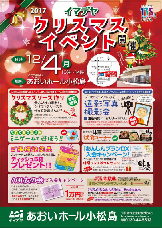 「AOI友の会」や「あんしんプランDX」のご契約者様はクリスマスリース作りやプロカメラマンによる遺影写真撮影会を無料でご利用いただけますのでぜひご参加ください。