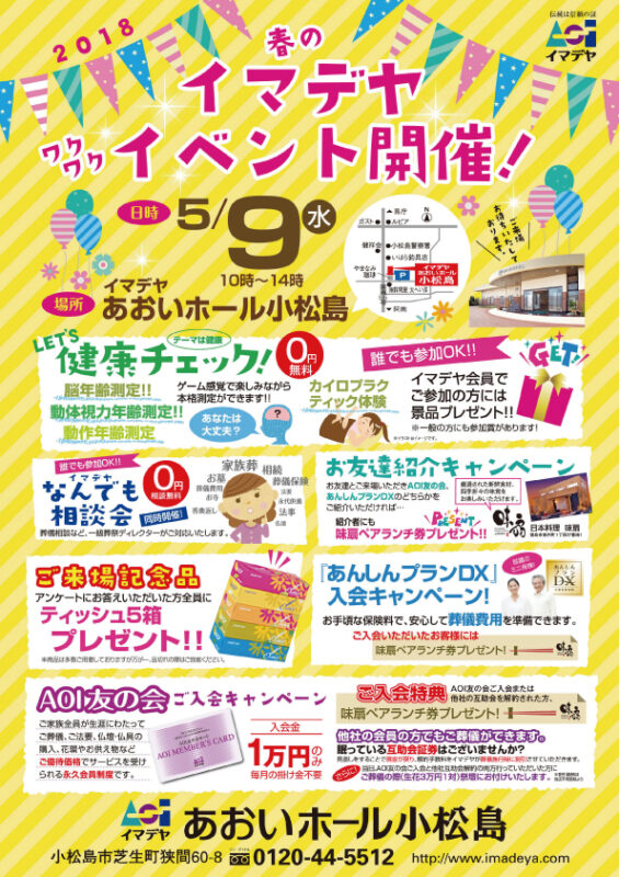 5月9日(水)10:00~ あおいホール小松島にて「春のイマデヤ わくわくイベント」を開催いたします。