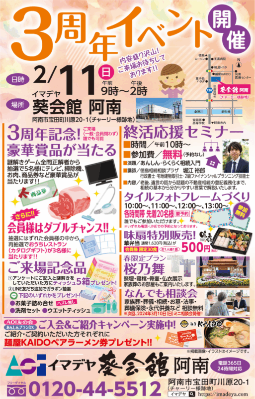 令和6年2月11日(日)午前9時~午後2時 イマデヤ葵会館阿南にて”3周年イベント”を開催させていただきます。