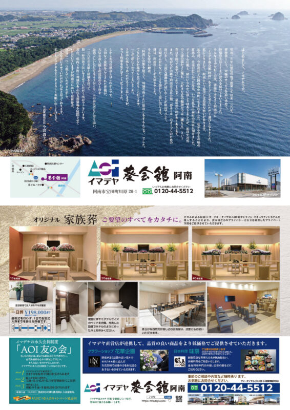 今年2月にオープンいたしました葵会館阿南。多くの方にご利用、内覧頂き厚く御礼申し上げます。とはいえ、まだまだ阿南市では新参者の弊社。阿南市に式場を開設した弊社の想いを広告にさせていただきました。ぜひご覧ください。